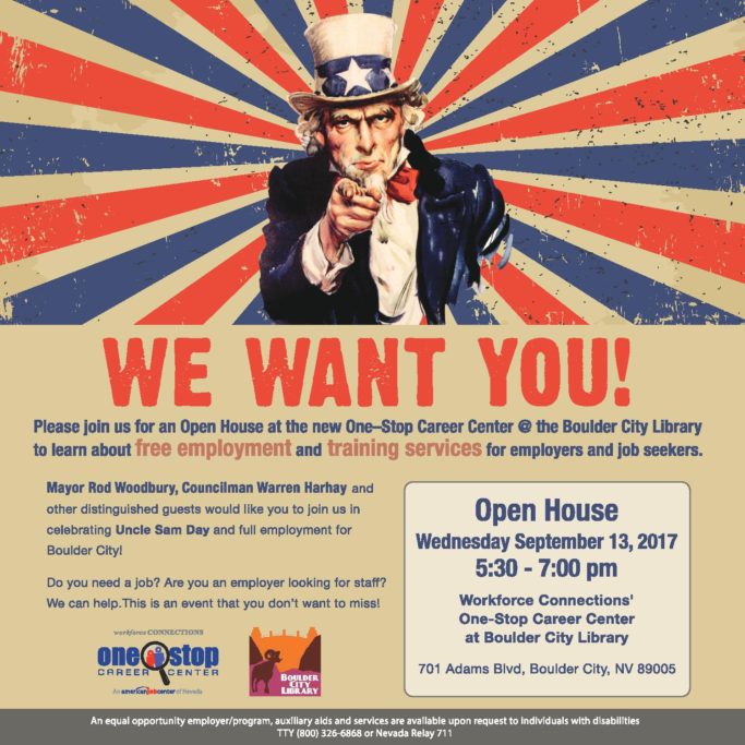 The new One-Stop Career Center at the Boulder City Library, 701 Adams Blvd., Boulder City, NV, would like to invite all employers and job seekers to an Open House to learn about free employment and training services.