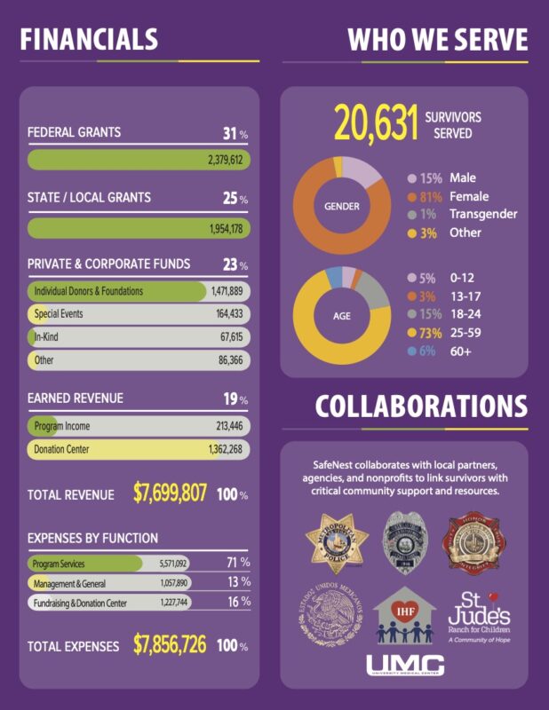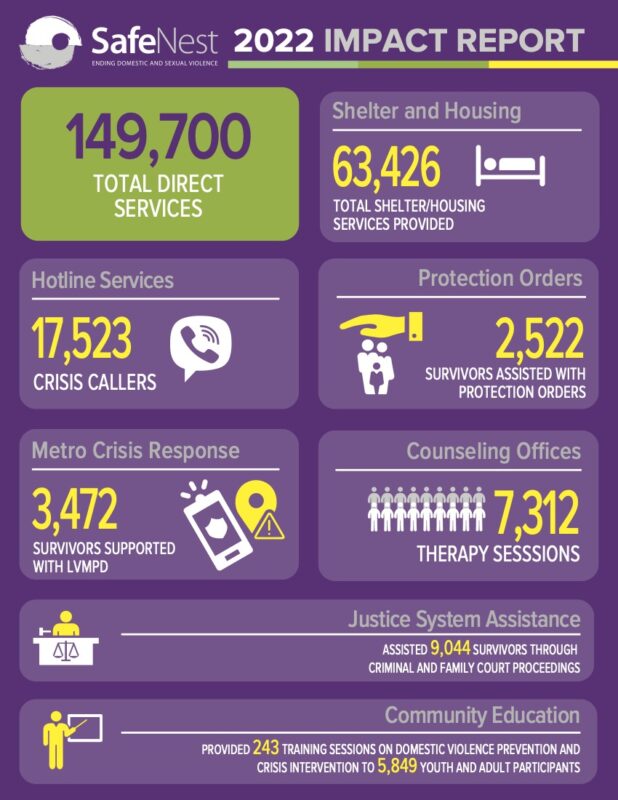 In 2022, SafeNest handled 17,523 crisis calls, assisted 2,522 survivors with protection orders, and provided 63,426 shelter/housing services. SafeNest’s full impact report for 2022 is below: