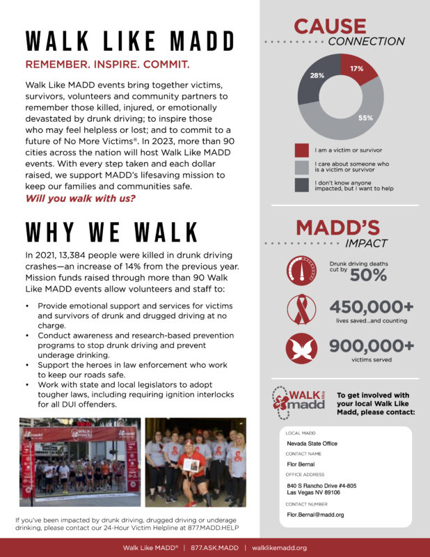 Registration is now open, volunteer opportunities are available, join hundreds of your neighbors for this life-saving event. Register to Walk Like MADD individually, join a team, or start a team yourself! For more information, visit the event website at www.walklikemadd.org/event/lasvegas or contact the event organizers at NV.State@MADD.org.