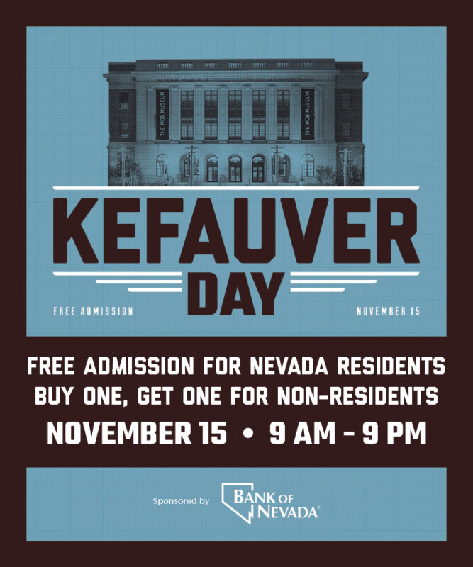 The Mob Museum, the National Museum of Organized Crime and Law Enforcement, announces FREE museum admission for Nevada residents (with I.D.) and buy-one, get-one admission for non-residents to celebrate Kefauver Day, which commemorates the U.S. Senate investigative hearing into organized crime that took place in the Museum’s courtroom on Nov. 15, 1950.