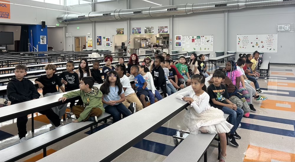 Students from kindergarten through fifth grade, along with their teachers and school principal, gathered to welcome representatives from Titan Brands Hospitality Group. Brian Norris, President of Titan Brands, and Carly Held, Director of Sales and Catering, shared their roles within the company while presenting the school with new supplies.