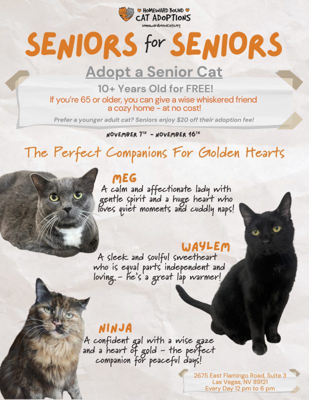 Can’t adopt but still want to help a senior cat? Consider a donation! Many senior cats have a longer length of stay so your donation will help us give them the best chance at finding a home. Make a tax-deductible donation online through the Homeward Bound website, or mailed to 2675 East Flamingo Road, Suite 3, Las Vegas, NV 89121.For more information, call 702-463-9996.